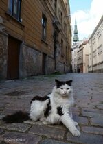 衣料品店の中から子猫が出てきました。店の準備が整って主人が迎えに来るまで、しばらく日向ぼっこをして過ごします。