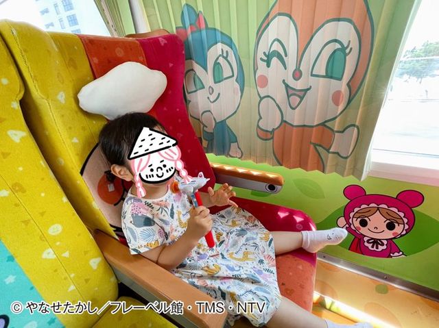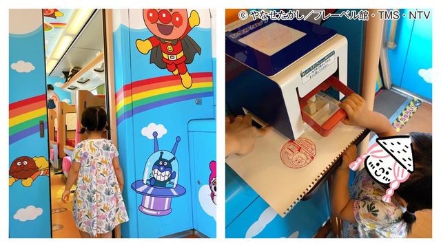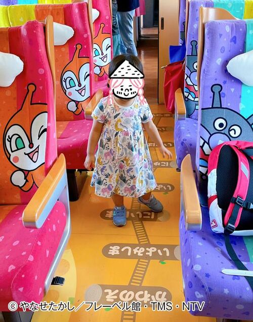 カラフルなアンパンマンシート。娘の席はテーブルが運転台風にデザインされていて、運転士ごっこができます
