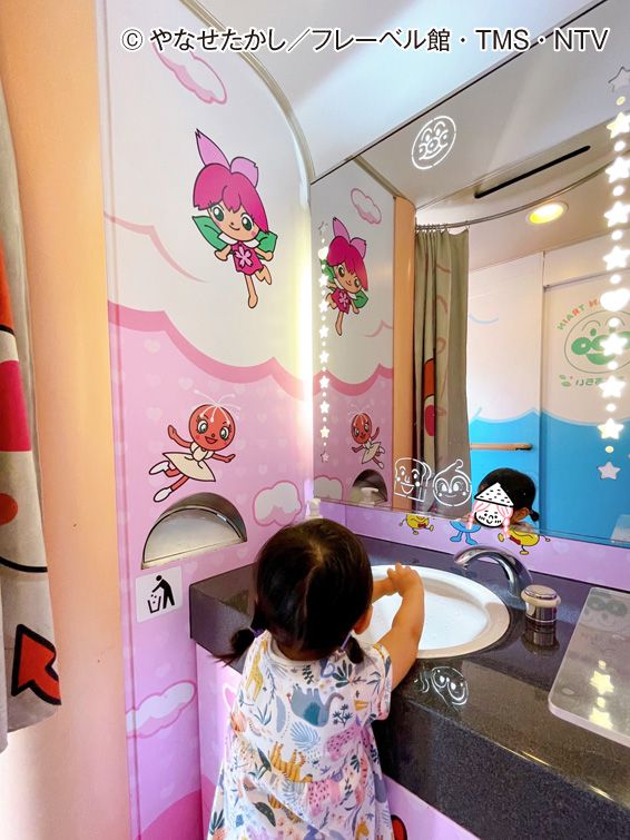 ピンクの夕空をイメージした可愛らしい洗面所は、カーテンにしょくぱんまん様ラブのドキンちゃんが描かれていたり、鏡がキラキラ光ったりして娘のお気に入りスポットでした。