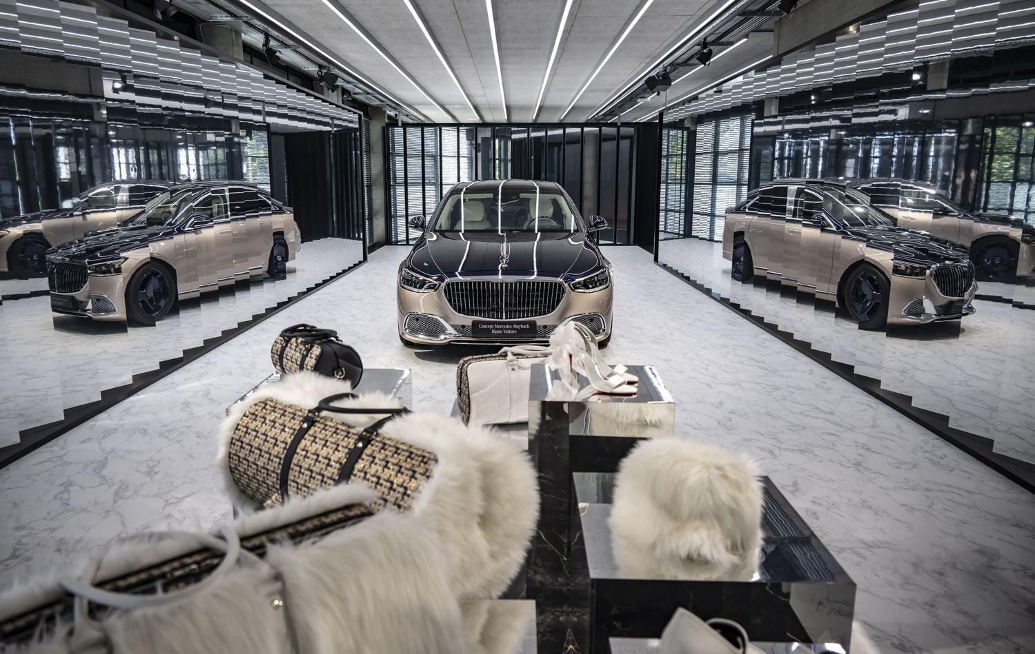 服飾の世界で扱われる素材をインテリアに採り入れた特別仕様車の“メルセデス・マイバッハ・オート・ヴォワチュール”。フェイクファーやブークレーなどがトリムに採用されている