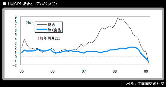 ◆中国の2月CPI(消費者物価指数)が前年同月比▲1.6%となり、マイナス圏に転落。これは2002年12月以来の出来事。豚肉価格高騰の反動があることを勘案し、除く食品ベースで見た場合でも、前年同月比は▲1.2%で、前月の同▲0.6%からマイナス幅は拡大した。また、サービス価格が前年同月比▲1.8%となっており、2カ月連続でマイナスになっていることも目を引く。