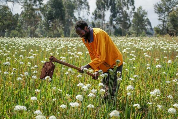 ロシアによるウクライナ侵略は肥料の価格高騰も引き起こしアフリカ諸国に深刻なダメージを与えている(写真は3月31日ケニアの首都ナイロビ近郊のお花畑で雑草を刈る農民、写真:AP/アフロ)