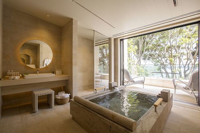 今回は温泉風呂付きの客室「別棟エグゼクティブツイン」を選んだ。御影石の温泉風呂とテラスがある極上の空間。プライベートが守られ、聞こえるのは木々のそよぎと鳥のさえずりだけだ。湯船にはナトリウム-塩化物泉の奥志摩浜島温泉が注がれる。なめらかな肌心地でよく温まり、体がほぐれて癒される。