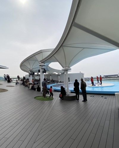 屋外のショープールも、一風変わっていて面白い。2階にある「海豚(イルカ)プール」は、観客席がウッドデッキのような仕上げで、最上段が広い斜面になっている。