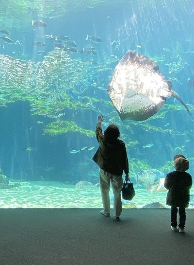 九十九島湾大水槽がすごい。まるでスキューバダイビングをしているかのように上部から自然光がさんさんと降り注ぐ。前述のように自然光を入れると藻が発生しやすいが、スタッフが毎日潜水して水槽内を清掃しているという。