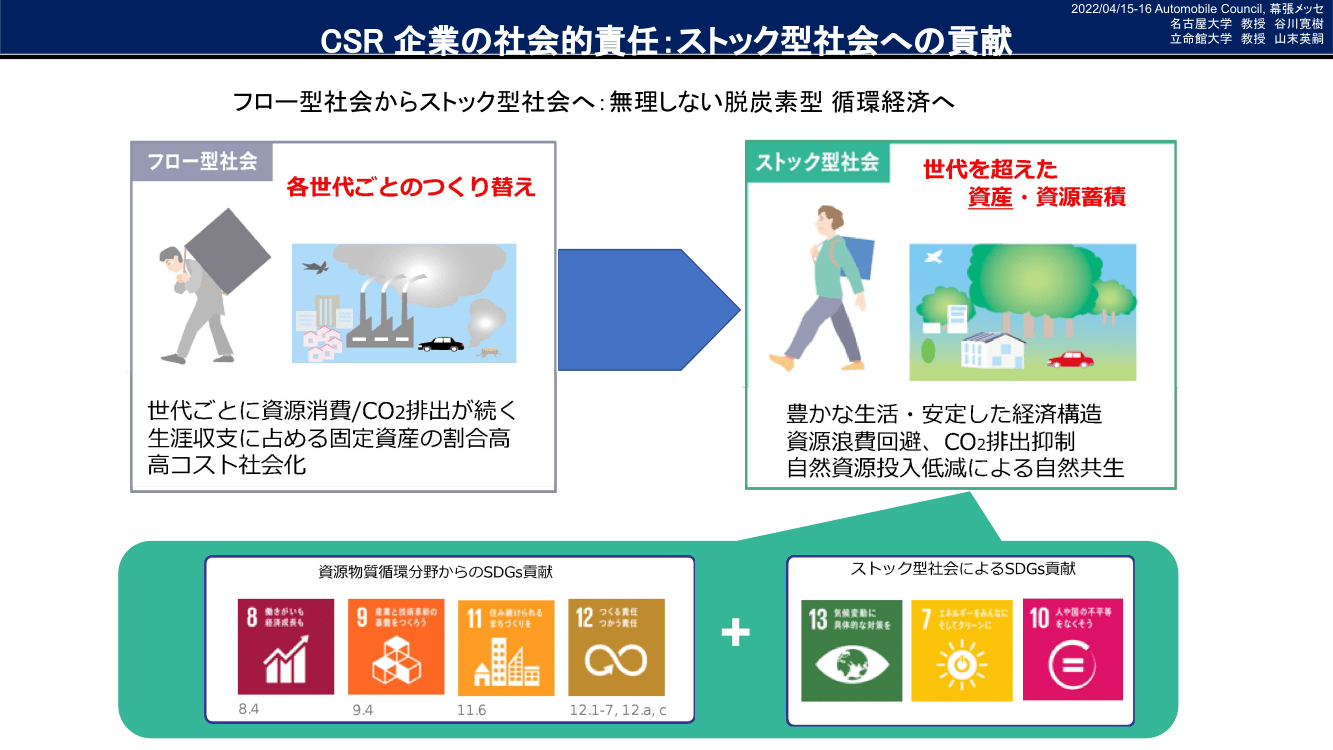 地下資源の採掘が自然環境に与える影響を小さくするうえで重要な考え方が、「フロー型社会からストック型社会への転換」だと谷川教授らは考えている。クルマを作るたびに新しい地下資源を掘り起こしていれば、地球はいつしか穴だらけになり、資源も枯渇してしまう。そうではなく、一度掘り起こした地下資源は、素材をリサイクルすることにより、新たな採掘を最小限に留める。これがストック型社会の基本的な考え方である。