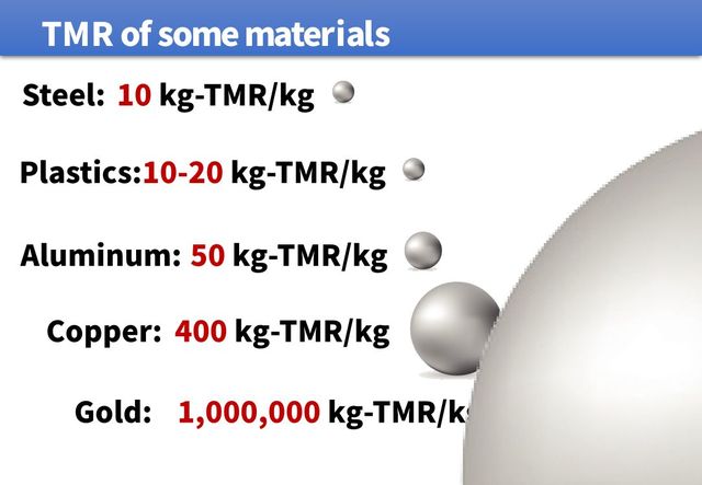 TMRは関与物質総量=Total Material Requirementの略。鉄1kgを得るために10kg、プラスチックで10から20kg、アルミニウムで50kg、銅で400kg、金で100万kgを採掘する必要がある。