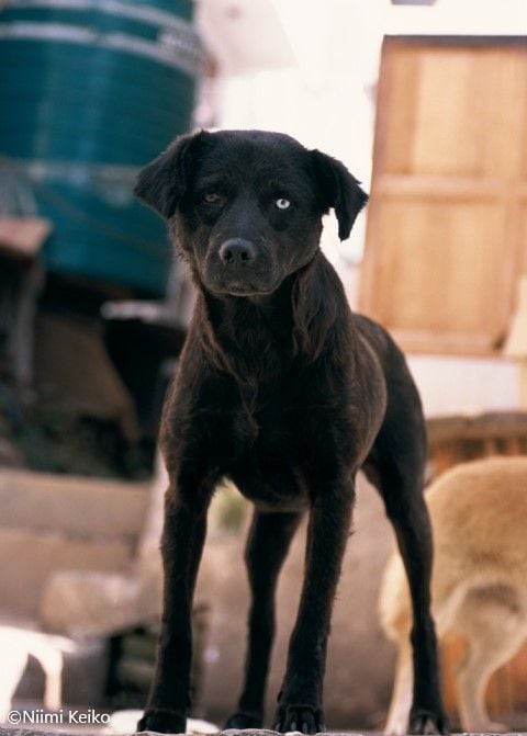 左右の目の色が違うオッドアイの犬がいました。この犬は、崖の上からわたしを見ていて、目が合うとちぎれんばかりにシッポを振りながら、駆け下りてきました。足ががっしりとしているのは、ふだんから崖を登ったり下りたりしているからかもしれません。