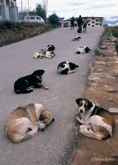 ティンプーには、野良犬がたくさんいます。朝8時ごろ、小学校へと続く道です。この道は車が通らないと知っていて、寝ているのでしょうか。