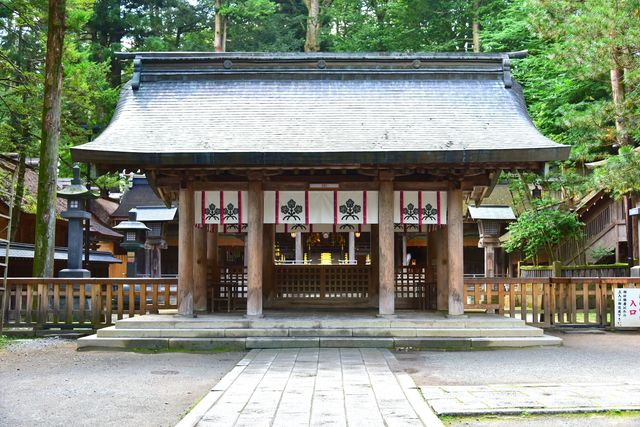 それ以外にも本宮で見るべきものは多いが、必ずチェックしたいのは、四隅に立つ御柱だ。7年に一度開催される有名な神事、式年造営御柱大祭(通称御柱祭)の際に山からモミの巨樹が切り出され、境内まで運ばれて四本の御柱となる。今年(2022年)は開催年に当たり、コロナ禍に配慮して常より規模を縮小した上で4月~6月にかけて行われた。