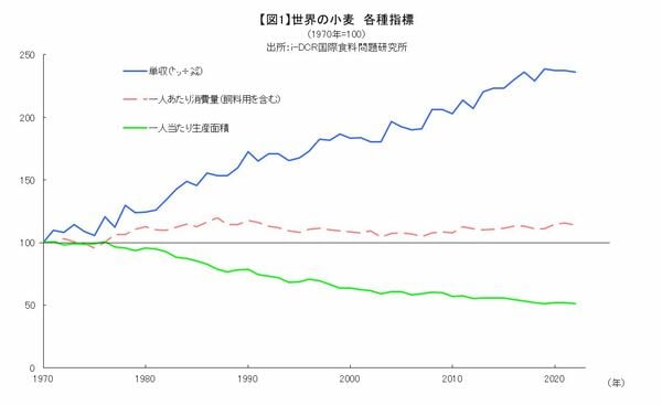 下の図1を見てください。倍増した人口によって、1人あたり生産面積が半減したのに対し、単収(単位面積あたりの収量)を大きく伸ばし、小麦など穀物の生産高は人口以上のペースで増加してきたのです。