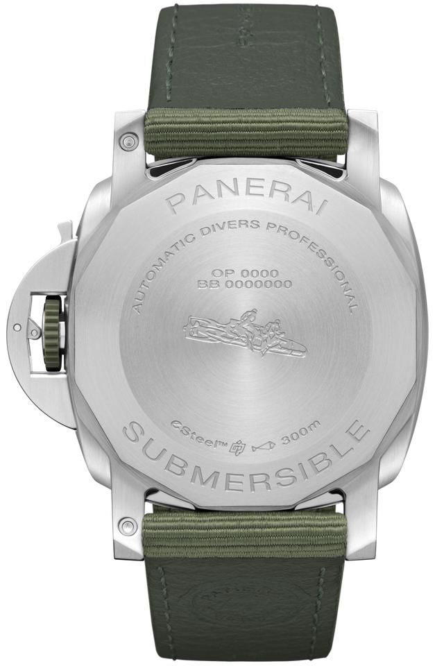裏蓋にはパネライウォッチのルーツでもある、イタリア海軍特殊潜水部隊の隊員が乗る「特殊潜水艇」が刻印されている