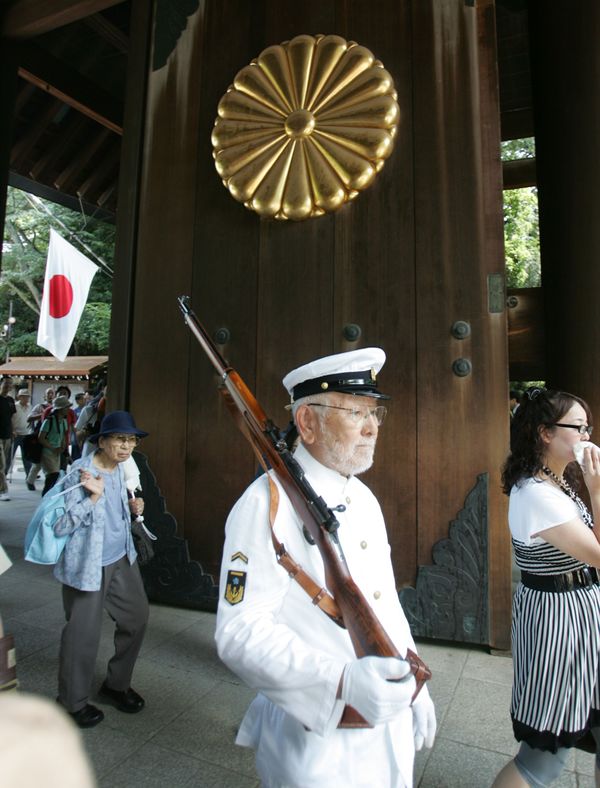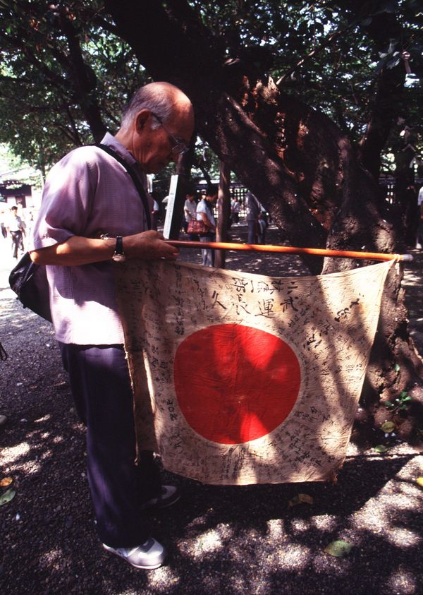 「八紘一宇」「七生報国」といったかつての軍国主義時代に叫ばれた熟語が神社内を飛び交い、年老いた旧軍の兵士たちが凛とした姿で行進している。戦地に持って行ったのであろう“武運長久”の寄せ書きがされた年代物の国旗。