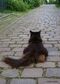 住宅街の路地の真ん中に、「とおせんぼ」をするように猫がいました。しっぽをふっています。なにげないふりをしていますが、耳の形を見れば、背後の様子に集中しているのが明らかです。