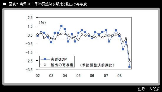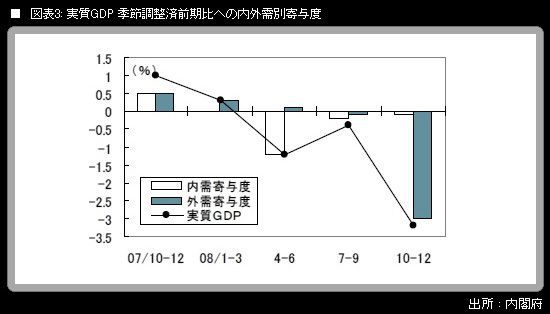 内閣府が12日に発表した昨年10-12月期の四半期別GDP2次速報(2次QE)で、実質GDPは前期比▲3.2%(同年率▲12.1%)。1次QE段階からはごく小幅の上方修正になった。それでも、第1次オイルショック後の1974年1-3月期に記録した戦後最悪の数字(前期比年率▲13.1%)に次ぐ景気の落ち込みであることに変わりはない。内外需別の寄与度は、内需が▲0.1ポイント(民間在庫品増加を主因に0.2ポイント上方修正)、外需が▲3.0ポイント(改定なし)。日本経済が10-12月期に「輸出急減ショック」に見舞われたことが、浮き彫りになっている。
