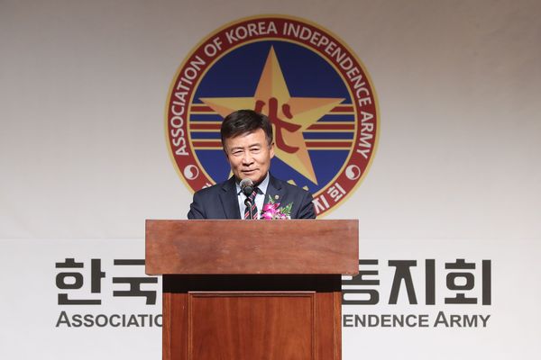 韓国光復軍創軍第79周年記念式で祝辞を述べる光復会の金元雄氏(当時)(写真:YONHAP NEWS/アフロ)