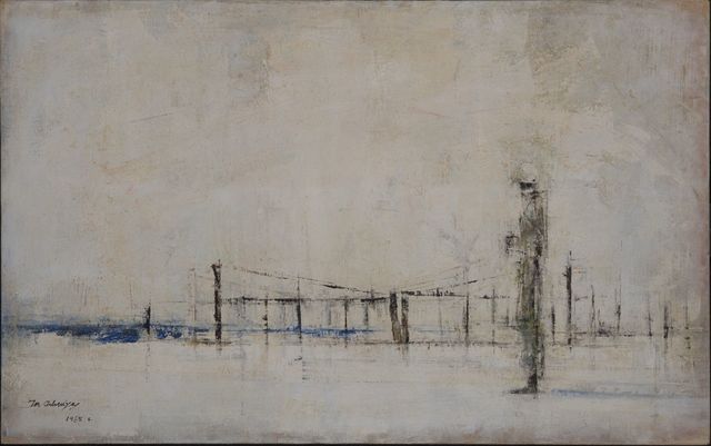 《望郷》は、現実と非現実の境が曖昧な印象で、半ば抽象画のように風景が描かれている。右側にどうやら一人の人間が立っており、背景はフェンスか何かのように見える。あなたはこの絵をどう見るだろうか。