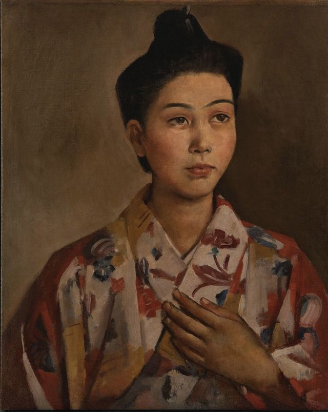 名渡山愛順(などやまあいじゅん)は沖縄の女性の美しさを描いた。《白地紅型を着る》は、白地で清楚涼しげな紅型を着た女性がポートレートで描かれている。髪は沖縄風の結い方で、清々しく、まさしく沖縄の美を感じさせる。