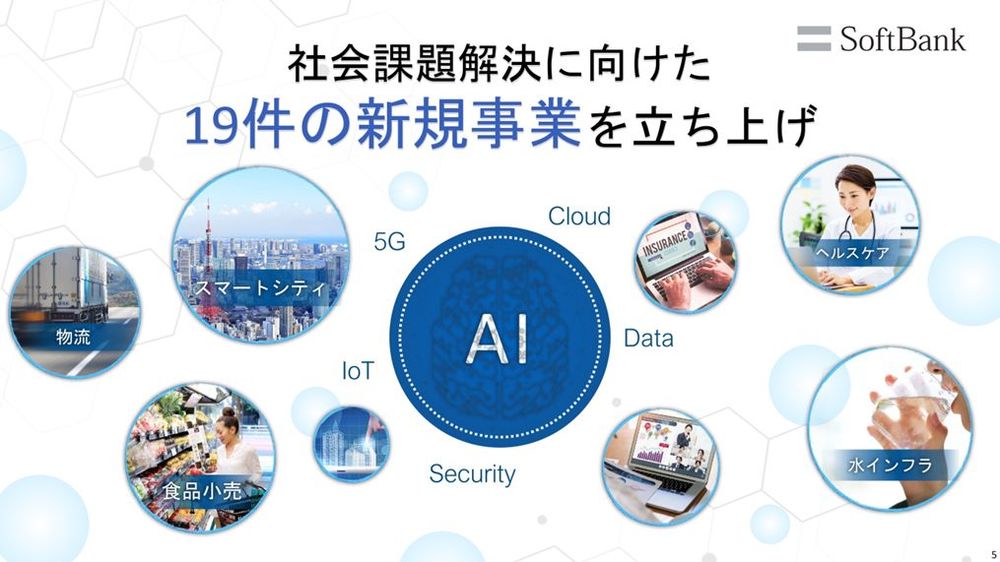 社会課題の解決を目指して、19の新規事業を立ち上げ。技術の中心にAIを配置し、その周囲を5G、IoT、Cloudなどで固め、物流、食品小売、ヘルスケア、社会インフラなどの領域で事業を実施する