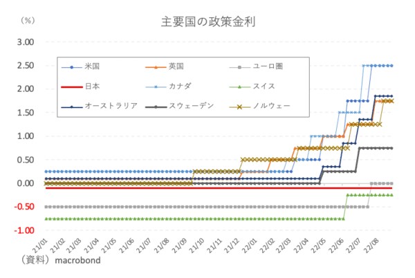 9月22日にはスイス国立銀行(SNB)の会合が予定されており、スイスの消費者物価指数(CPI)を巡る状況が前回6月会合から大して改善していないことを思えば、恐らく今回も+50bpの利上げが予想される。そのスイスの決定をもって、円は「世界で唯一のマイナス金利通貨」に位置づけられることになる(図表1)。