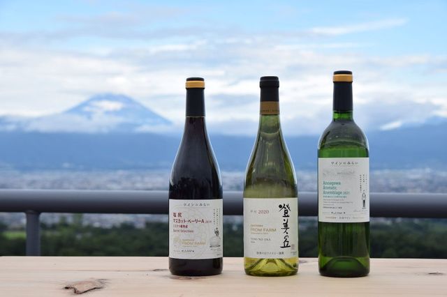 左が『塩尻マスカット・ベーリー A2019 ミズナラ樽熟成 バレルセレクション』、中央が『登美の丘 甲州 2020』、右が『梓川アロマティックアッサンブラージュ 2021』。奥は『富士山』。