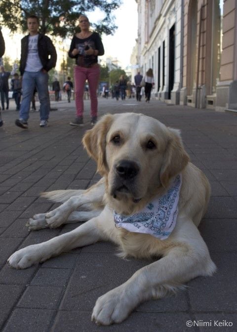 遊歩道沿いには、ブランド品店、カフェ、ドラッグストアなどが軒を連ねています。ブティックの犬が、店の前でたたずんでいました。オーナーが店に立ち寄る際にいっしょに来て、用事が済むまで店の前で待つのだそうです。名前を聞いたので「レックス!」と呼んでみました。すると……