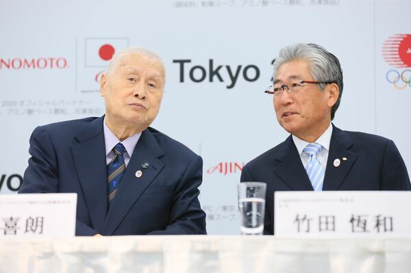 2016年3月、2020年東京五輪・パラリンピックのオフィシャルパートナー発表会見に登壇した森喜朗大会組織委会長と竹田恒和JOC会長(ともに当時。写真:YUTAKA/アフロスポーツ)
