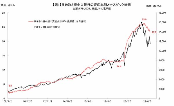 こうした中銀のスタンスに転機が訪れたのは、ロシアのウクライナ侵攻でした。エネルギーや食糧などの物価高が引き起こされ、本格的なインフレが訪れたからです。3極中銀の資産合計は今年2月下旬の25兆ドルをピークに、直近は22.6兆ドルまで縮小しています。それに伴って株価も下落し始めました。