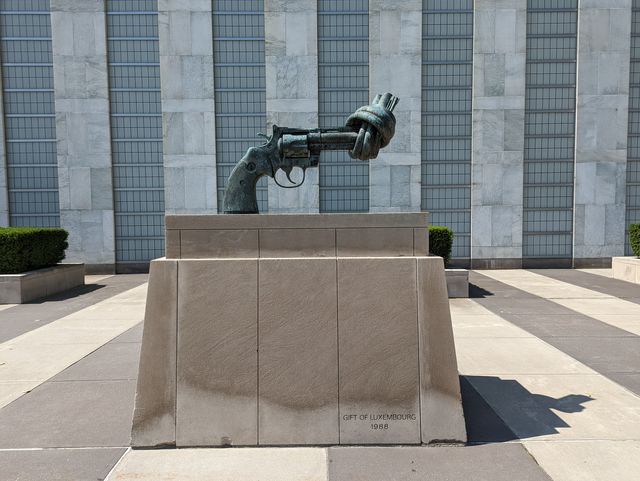 The Knotted Gunは国連本部で展示されている非暴力をテーマとしたオブジェ。スウェーデンのアーテイスト、カール・フレデリック・ロイタースワルトがコルト・パイソン357拳銃をモデルに1984年に作成した。1988年ルクセンブルグ政府が購入し国連に寄贈した。以来銃身を結んだこの形は非暴力のシンボルとなっている