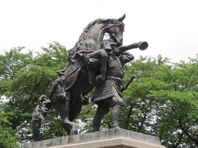 深谷市の畠山重忠公史跡公園にある馬を背負う畠山重忠の銅像