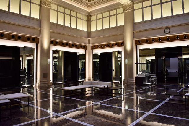 館内は天井から自然光が差し込むホワイエ(広場)を囲むように 4つの展示室が配された造り。展示室内に竣工当時のエレベーターが残されているなど、美術品だけでなく空間自体も見ごたえがある。