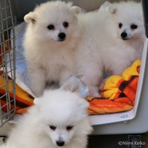 この子犬たちは、ヴォルピーノ・イタリアーノという種類で、古代ローマ時代から大切にされてきた犬種だそうです。「獣医さんでワクチン接種をしてきたんだ。家に着くまでもう少しだけど、子犬たちに負担が少ないよう休憩を取っているのさ」と、おじさん。子犬たちが入っているケージにはキャスターが付いていますが、石畳の道では使えません。休憩がすんだら2匹ずつ抱いて家まで歩くとのことでした。