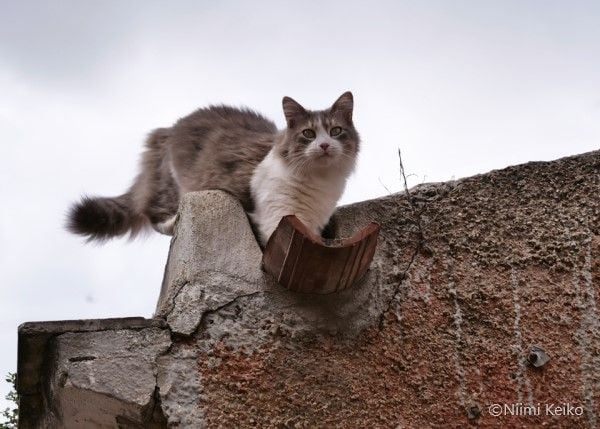 2分後、どうやって降りたのか、その猫は路地を歩いていました。