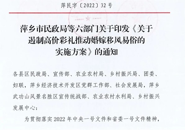 彩礼が最も高いのは江西省の東部と言われていて、60万元(約1200万円)が求められることもあるそうです。江西省の平均年収は約6万元なので、その10倍以上の金額だということです。この地域では彩礼金額を3万元に制限するという通知が出たほどです(「彩礼不超3万!一地官方发文」、https://www.163.com/dy/article/H87NE6OH0550FW1B.html)。