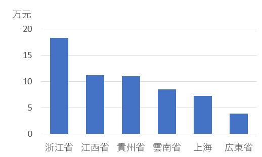 グラフで最も金額が多いのが浙江省で約18万元(約360万円)です。そのあと江西省、貴州省などの「地方」が続きます。一方上海や広東省などの「都市部」は金額が少ないことが見て取れます。