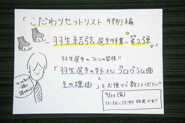 番組告知用の手書きポスター。羽生結弦の『SEIMEI』の衣装で使用された若草色と紫にちなみ、マーカーで線を引いている