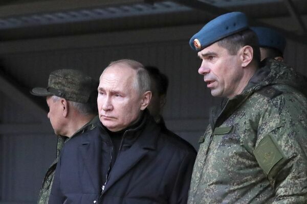 10月20日、モスクワ南東部リャザニを訪れ、ロシア軍兵士の訓練を視察したプーチン大統領。左はショイグ国防相(写真:代表撮影/AP/アフロ)