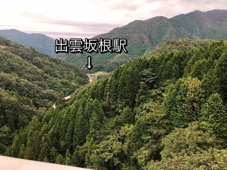 出雲坂根駅がすごく小さく下のほうに見えて、標高差も実感。出雲坂根のスイッチバックのダイナミック感、イリュージョンといわれる訳がすごくよく分かりますよ。