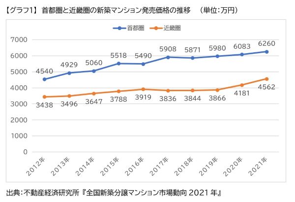 近畿圏も同様で、2012年には3438万円だったが、2021年は4562万円と上昇率は32.7%に達する。首都圏よりは若干低い上昇率とはいえ、特に直近の1、2年の上昇率が高くなっているのが目立つ。