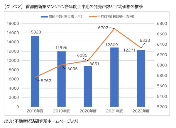 新規発売戸数も2021年度上半期の1万2809戸から、2022年度上半期は1万2271戸に減少している。地価や建築費の高騰などによって適正価格での供給が難しくなっているため、新規発売戸数で先細りの傾向が強まっていることを反映した結果といっていいだろう。