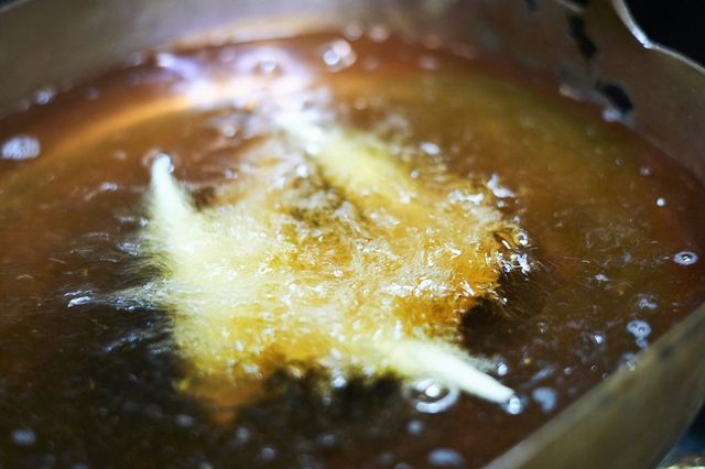 7.サラダ油を160℃に熱し、6の表面が固まるまで揚げて一度取り出し、180℃で表面がきつね色になるまで二度揚げする。