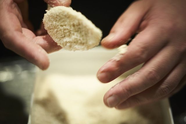 6.形を整えた5の上部まで4を詰め、上部表面にAを塗ってパン粉を薄くまぶす。