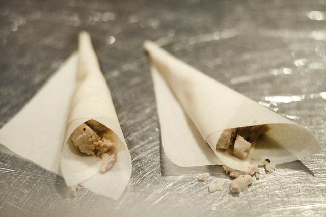 5.春巻きの皮に4をのせ、ブーケ状(円錐形)に包んで形を整え、Aを混ぜた液を塗って端を止める。