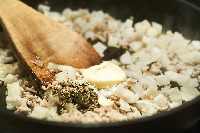 3.フライパンを火にかけ、バターを溶かして玉ねぎを炒める。やや透き通ってきたら豚ひき肉を加え、火が通ったところにれんこんを入れて塩とブラックペッパー、マヨネーズで味付けし、火を止める。