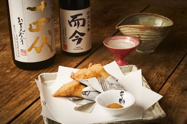 フィッシュ&チップスからイメージしたという細身の「手巻き」サイズに、ほっくりとした芋、アクセントとなるれんこんのシャキシャキ感。また、添えられたカレー塩が華やかに香りつつ、繊細な日本酒の甘みと合う。「揚げた芋はアテには重い…」などという考えを心地よく裏切ってくれる一品だ。