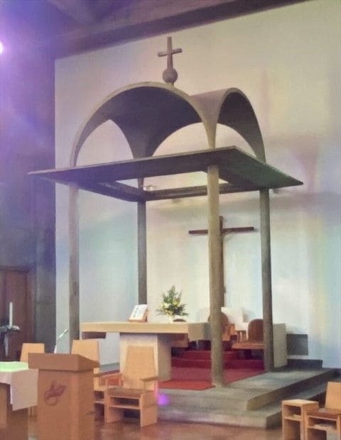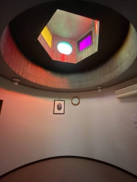 祭壇中央の天蓋はコンクリート製。シェル構造の上部が信じられないほど薄い。目視では10cmを切っているように見える。この薄さで鉄筋は入っているのだろうか。この天蓋だけでも、資料があれば1本記事が書けそうだ。