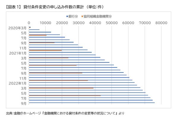 2020年3月には全国の銀行に1028件の条件変更の申し込みがあり、4月には5730件、5月には6637件と急増した。2022年に入ってからは比較的落ち着いているとはいえ、依然として相談がなくならない。【図表1】にあるように、2022年9月段階で、全国の銀行への申し込み件数が累計で7万件を超え、月間1000件以上の返済条件変更の申し込みがあるのが現実だ。