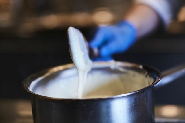 3.2に牛乳を残りの継ぎ足しながら、再度滑らかな液状になるまで混ぜ、塩とコショウ、ナツメグを加える。