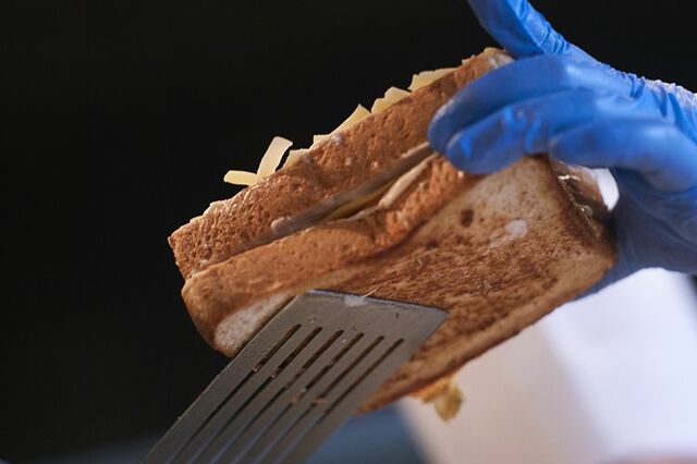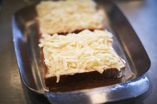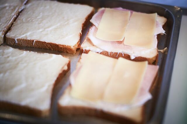 4.食パンによく混ぜた3をまんべんなく塗り、ハムとスライスのグリュイエルチーズを重ねてもう1枚の食パンで挟む。その上部にもベシャメルソースを塗り広げてシュレッドチーズをたっぷりのせる。