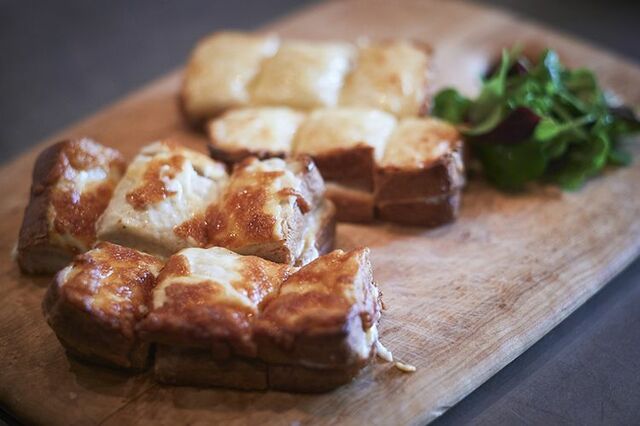 写真上は店のレシピ。下は、スーパーで購入できる全粒粉の食パンとスライスチーズを使用。一口サイズにカットすれば、ホームパーティの一品にも。